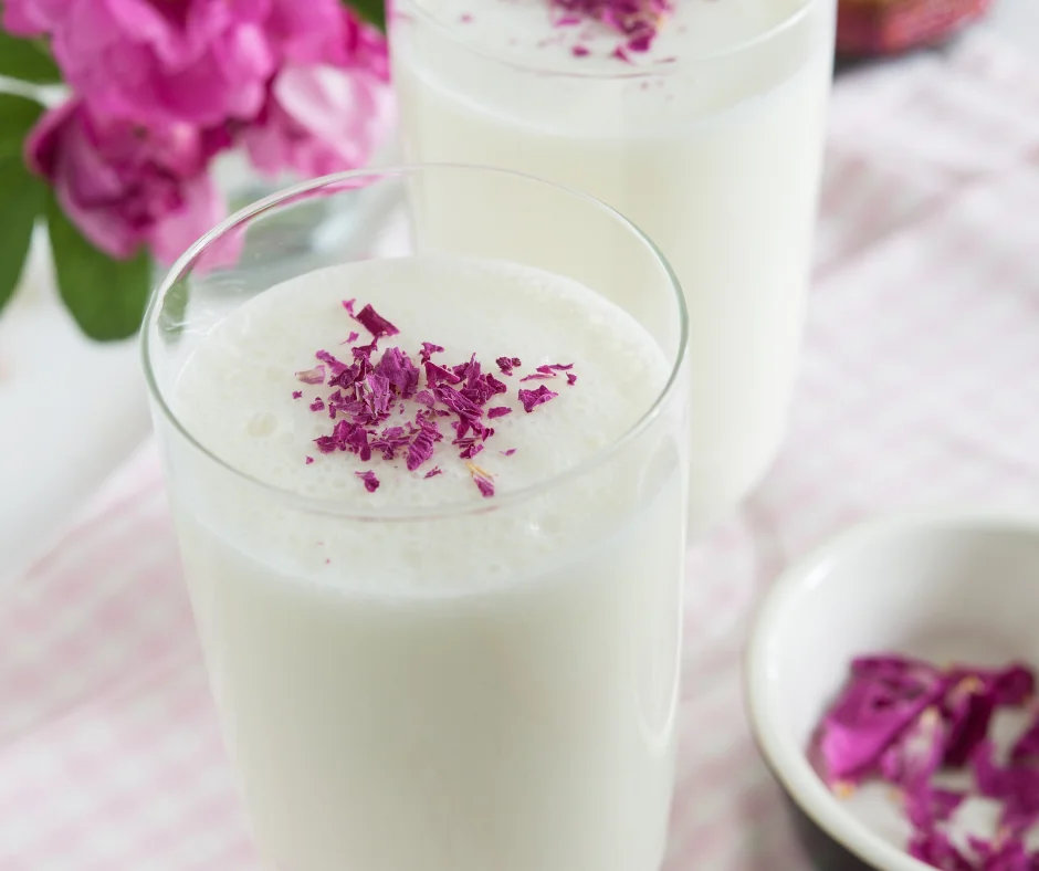 - Mettre dans un mélangeur, le yogourt, l’eau la cardamome, le sucre, les pétales de rose et l’eau de rose.
